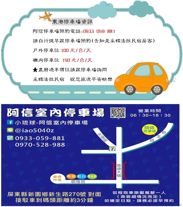 東港碼頭停車服務:(請先電話詢問預約聯絡。並告知為民宿的客人)